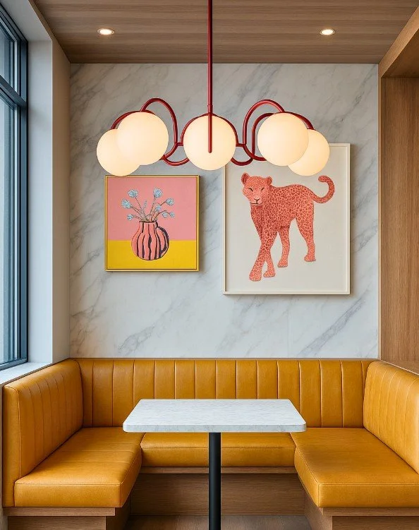A cozy booth area with a white marble table, mustard yellow leather seating, a modern chandelier with five globe lights, and artwork of a pink vase with flowers and a pink leopard on the wall.
